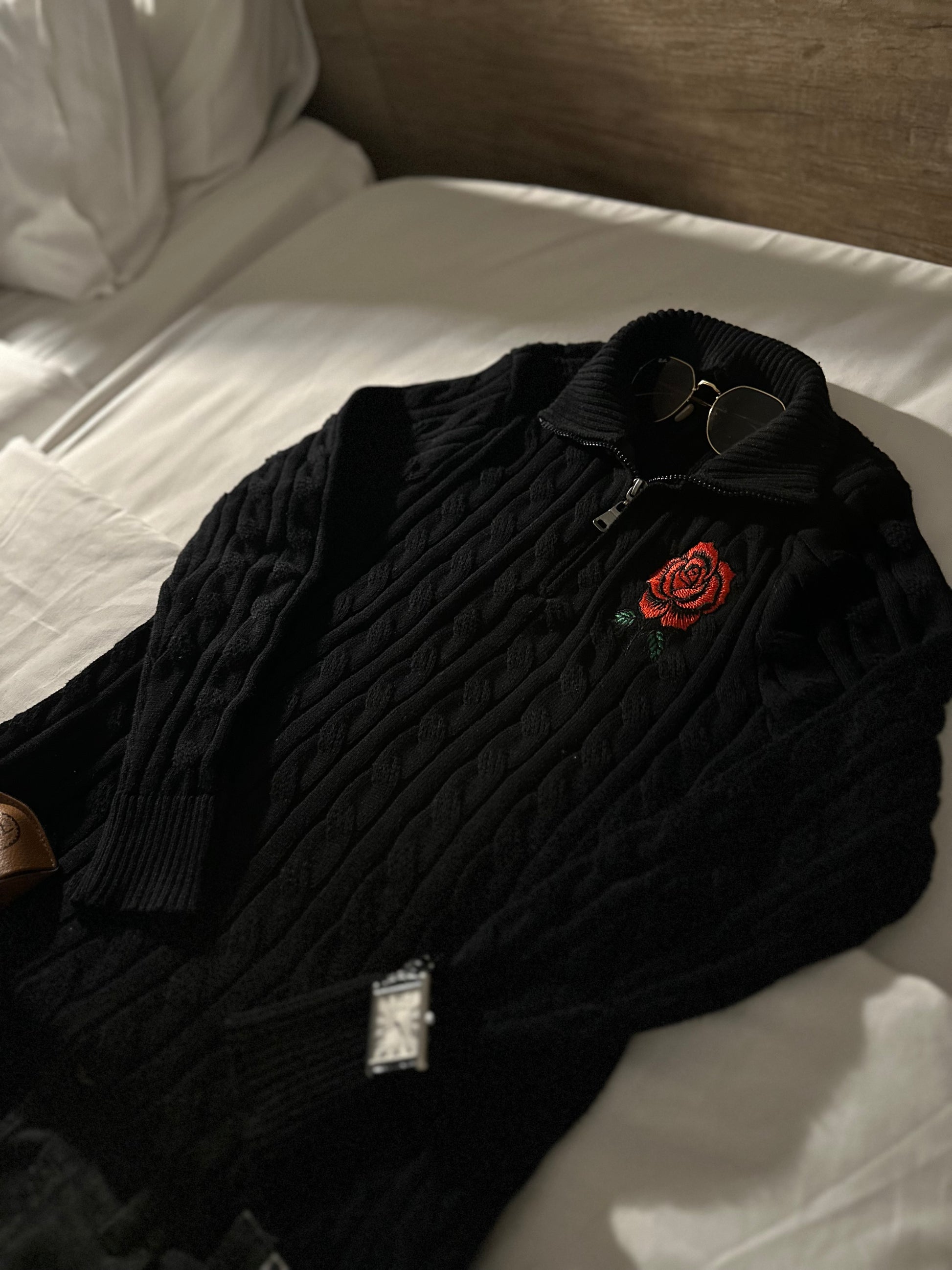 Stay effortlessly stylish with the Midnight Rose Half-Zip Sweatshirt. Crafted from 100% premium cotton, this classic black knit offers the perfect blend of breathability and warmth. The half-zip design allows for adjustable comfort, making it easy to style for any occasion. Ribbed cuffs and hem provide a snug fit, perfect for layering or wearing on its own. Adding a touch of sophistication, an embroidered rose logo graces the chest, creating a subtle yet striking detail. A must-have for those who appreciate timeless elegance with a modern edge.